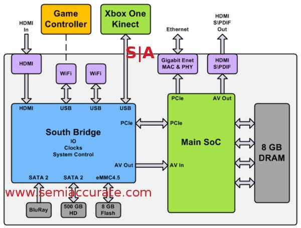 Xbox One system architecture diagram from Hot Chips 25. PCIe is used to connect the Xbox SoC to both the South Bridge and NIC, while SATA is connects the BD drive and HDD.